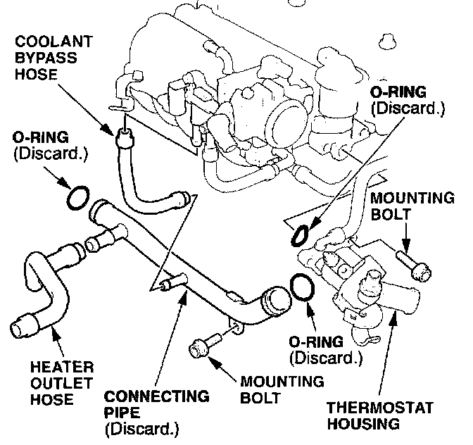 11. Position the new 0-ring on the back of the thermostat housing, and slide the connecting pipe into the housing, being careful not to damage either 0-ring.
