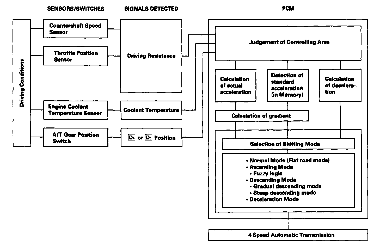 The PCM compares actual driving conditions with memorized driving conditions, based on the input from the countershaft speed sensor, the throttle position sensor, the engine coolant temperature sensor, the brake switch signal, and the shift lever position signal, to control shifting while the vehicle is ascending or descending a slope, or reducing speed.