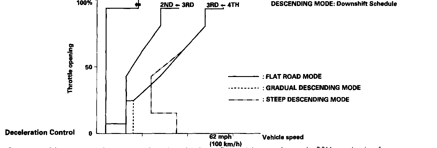 When the PCM determines that the vehicle is going down a hill in [D4] and [D3] positions, the shift-up speed from, 3rd to 4th gear and from 2nd to 3rd (when the throttle is closed) becomes faster than the set speed for flat road driving to widen the 3rd gear and 2nd gear driving areas. This, in combination with engine braking from the deceleration lock-up, achieves smooth driving when the vehicle is descending. There are three descending modes with different 3rd gear driving areas and 2nd gear driving areas according to the magnitude of a gradient stored in the PCM. When the vehicle is in 4th gear, and you are decelerating and applying the brakes on a steep hill, the transmission will downshift to 3rd gear. When you accelerate, the transmission will then return to 4th gear.