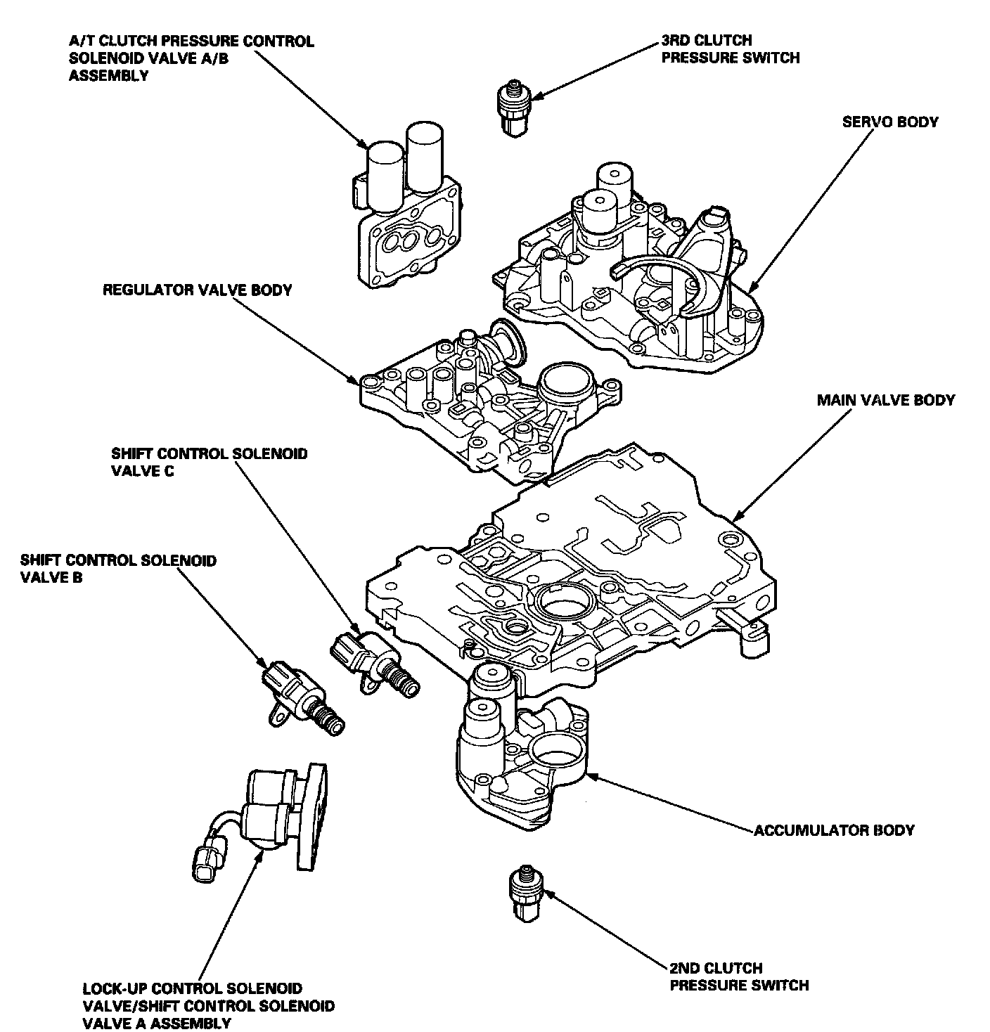 HYDRAULIC CONTROLThe valve body includes the main valve body, the regulator valve body, the servo body, and the accumulator body. The ATF pump is driven by splines on the right end of the torque converter which is attached to the engine. Fluid flows through the regulator valve to maintain specified pressure, through the main valve body, to the manual valve, directing pressure to each of the clutches. The shift control solenoid valves B and C are mounted on the outside of the torque converter housing. The shift control solenoid valve A and the lock-up control solenoid valve are mounted on the torque converter housing as an assembly. The A/T clutch pressure control solenoid valves A and B are mounted on the transmission housing.