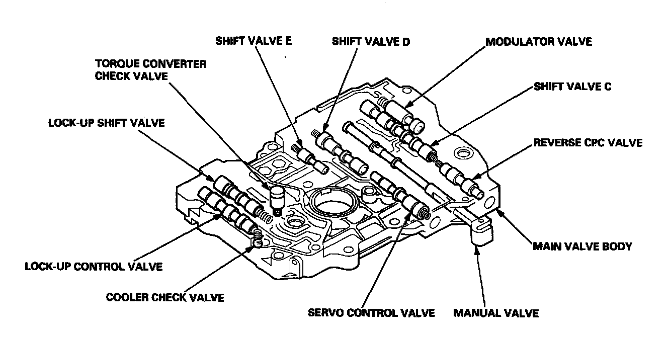 The main valve body contains the manual valve, the modulator valve, the shift valve C, the shift valve D, the shift valve E, the servo control valve, the torque converter check valve, the reverse CPC valve, the lock-up shift valve, the lock-up control valve, the cooler check valve, and the ATF pump gears. The primary function of the main valve body is to switch fluid pressure on and off and to control hydraulic pressure going to the hydraulic control system.