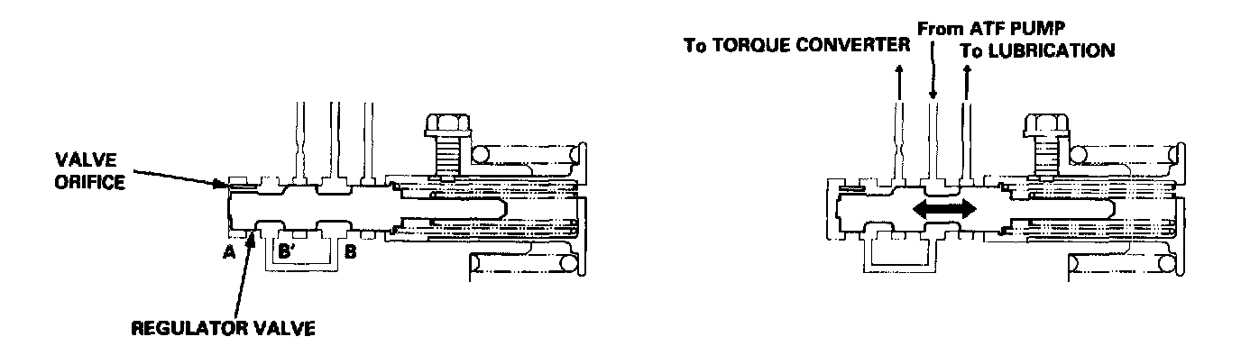 The regulator valve maintains constant hydraulic pressure from the ATF pump to the hydraulic control system, while also furnishing fluid to the lubricating system and torque converter. The fluid from the ATF pump flows through B and B'. Fluid entering from B flows through the valve orifice to the A cavity. This pressure of the A cavity pushes the regulator valve to the right side, and this movement of the regulator valve uncovers the fluid port to the torque converter and the relief valve. The fluid flows out to the torque converter and the relief valve, and the regulator valve moves to the left side. According to the level of the hydraulic pressure through B, the position of the regulator valve changes, and the amount of fluid from B' through torque converter also changes. This operation is continued, maintaining the line pressure.