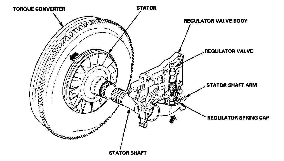Increases in hydraulic pressure according to torque are performed by the regulator valve using stator torque reaction. The stator shaft is splined with the stator in the torque converter, and its arm end contacts the regulator spring cap. When the vehicle is accelerating or climbing (Torque Converter Range), stator torque reaction acts on the stator shaft, and the stator arm pushes the regulator spring cap in the direction of the arrow in proportion to the reaction. The stator reaction spring compresses, and the regulator valve moves to increase the line pressure which is regulated by the regulator valve. The line pressure reaches its maximum when the stator torque reaction reaches its maximum.