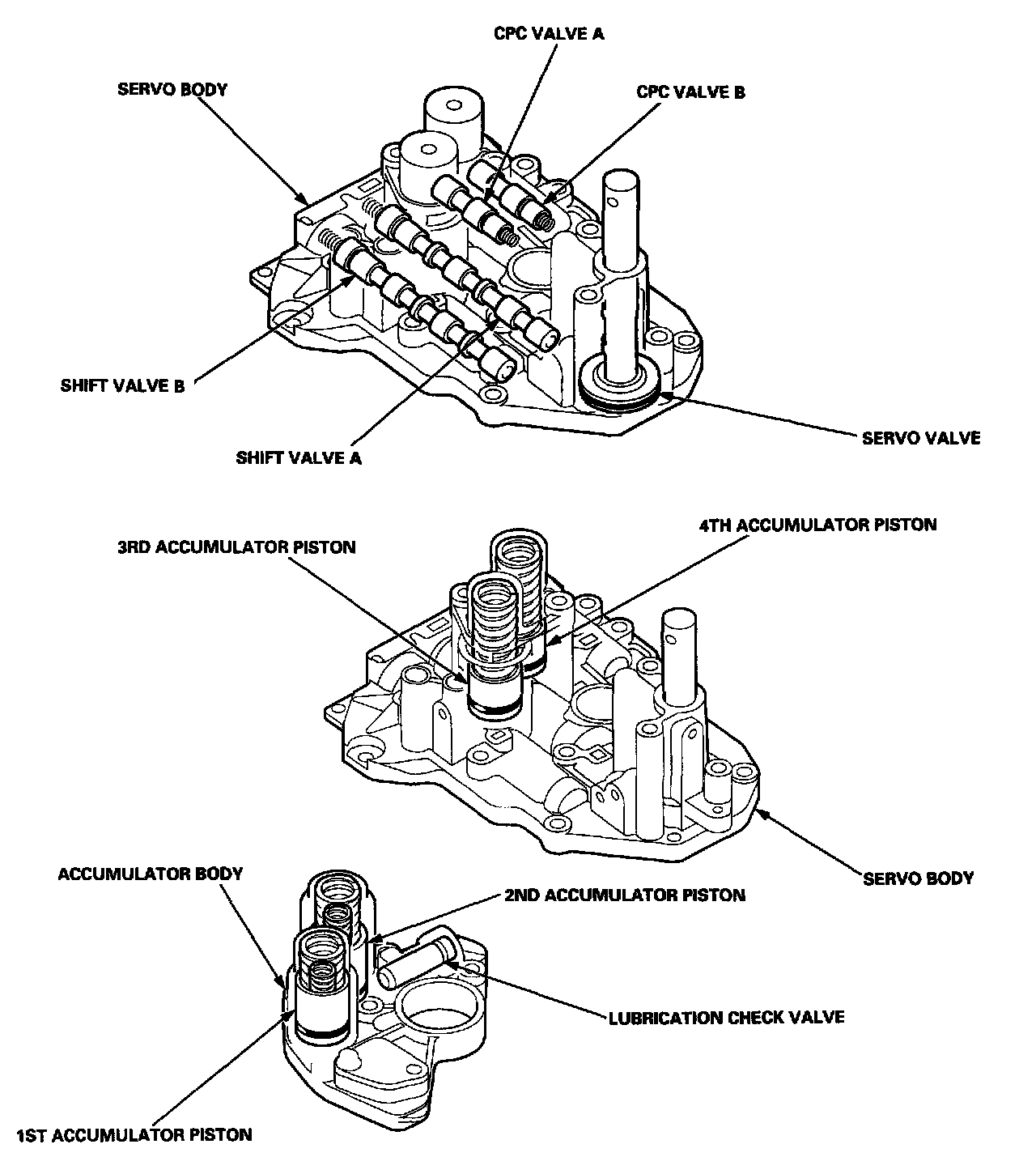 The servo body is on the main valve body. It contains the servo valve, the shift valve A, the shift valve B, the CPC valves A and B, and the 3rd and 4th accumulators.
