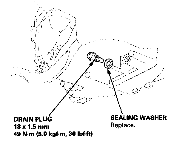 7. Raise the vehicle, and make sure it is securely supported. Remove the drain plug, and drain the Automatic Transmission Fluid(ATF). Reinstall the drain plug with a new sealing washer.