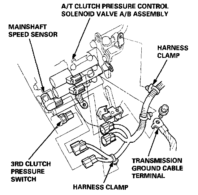 31. Connect the connectors to the mainshaft speed sensor, A/T clutch pressure control solenoid valve A/B assembly and 3rd clutch pressure switch, and install the harness clamps on the clamp brackets. Do not allow water, fluid, oil, dust, or other foreign particles to get inside the 3rd clutch pressure switch connector.