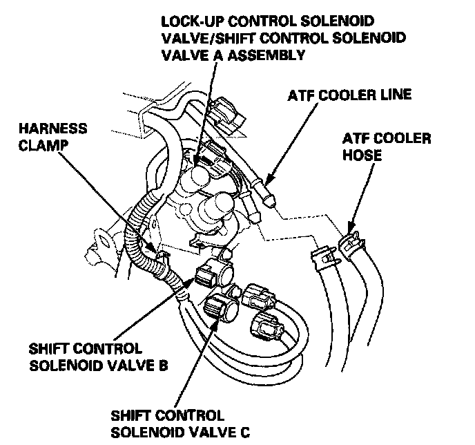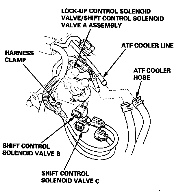 12. Disconnect the shift control solenoid valve B connector, and C connector, then remove the harness clamp from the clamp bracket.
