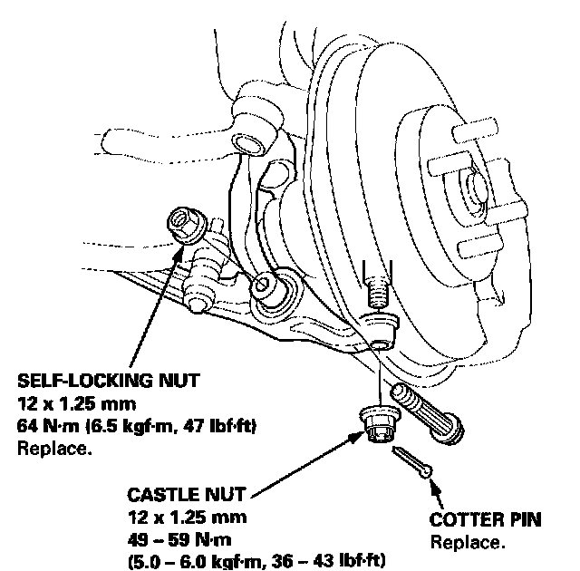 22. Install the ball joints on each lower arms with the castle nuts and new cotter pins.
