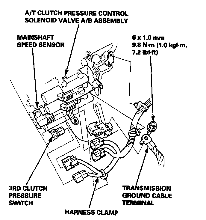 9. Remove the transmission ground cable terminal, and disconnect the connectors from the A/T clutch pressure control solenoid valve A/B assembly, mainshaft speed sensor, and 3rd clutch pressure switch, then remove the harness clamps from the clamp brackets.