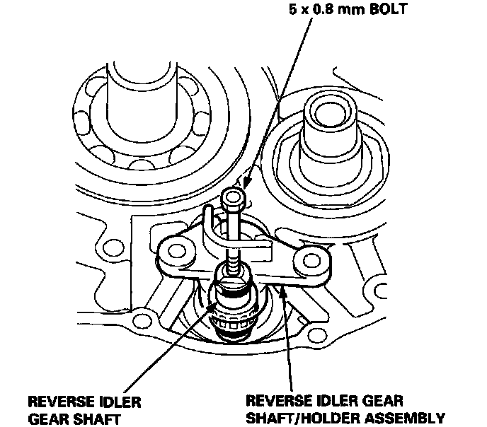 3. Install a 5 x 0.8 mm bolt in the reverse idler gear shaft as shown, then remove the reverse idler gear shaft/holder assembly.