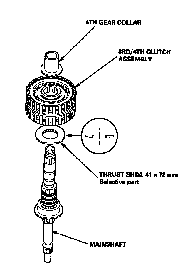 2. Hold the 4th gear collar against the clutch assembly, then measure the clearance between the clutch guide and the 4th gear collar with a feeler gauge as shown.
