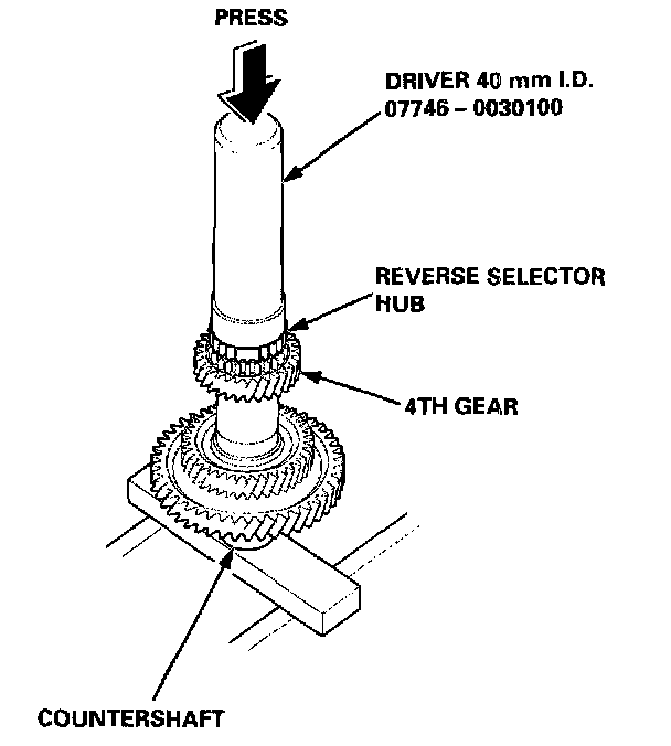 1. Align the shaft splines with those on 1st gear, then press the countershaft into the 1st gear using a press as shown.