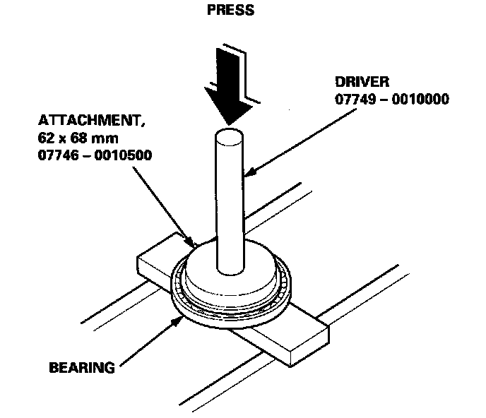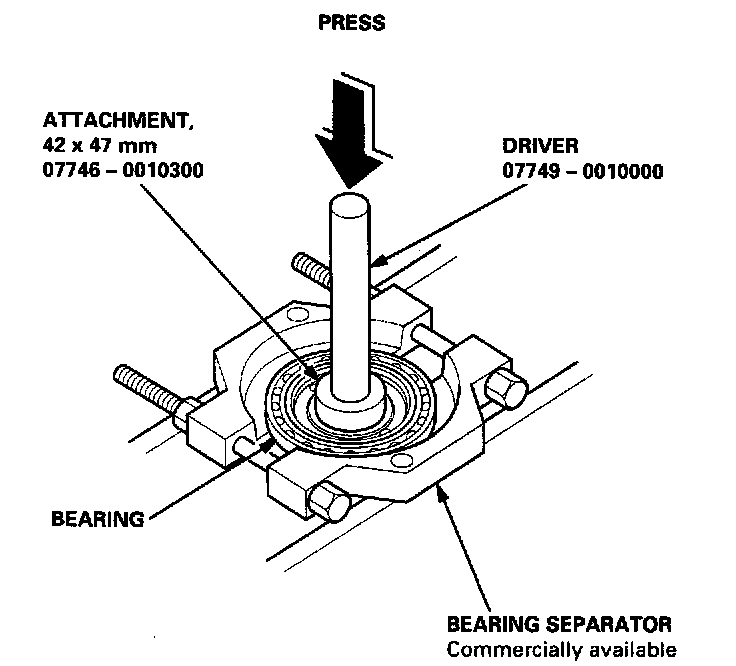 1. Remove the bearing from the bearing hub using a bearing separator and a press as shown.
