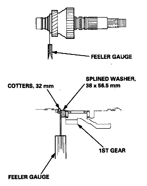 2. Measure the clearance between the 38 x 56.5 mm splined washer and cotters with a feeler gauge.