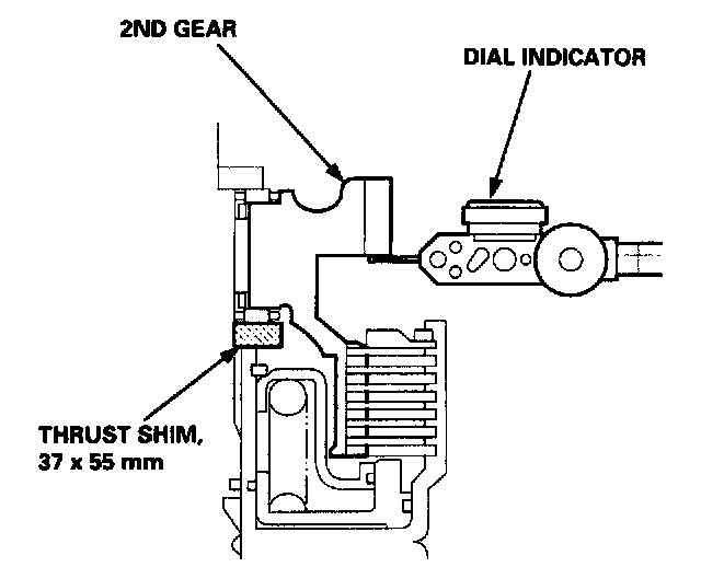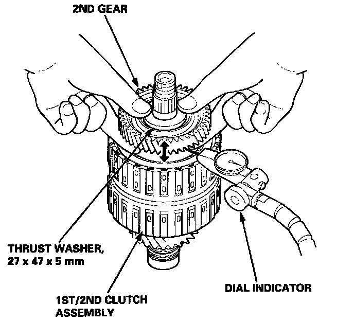 9. Hold the 27 x 47 x 5 mm thrust washer against the clutch assembly, and measure the 2nd gear axial clearance while moving the 2nd gear.