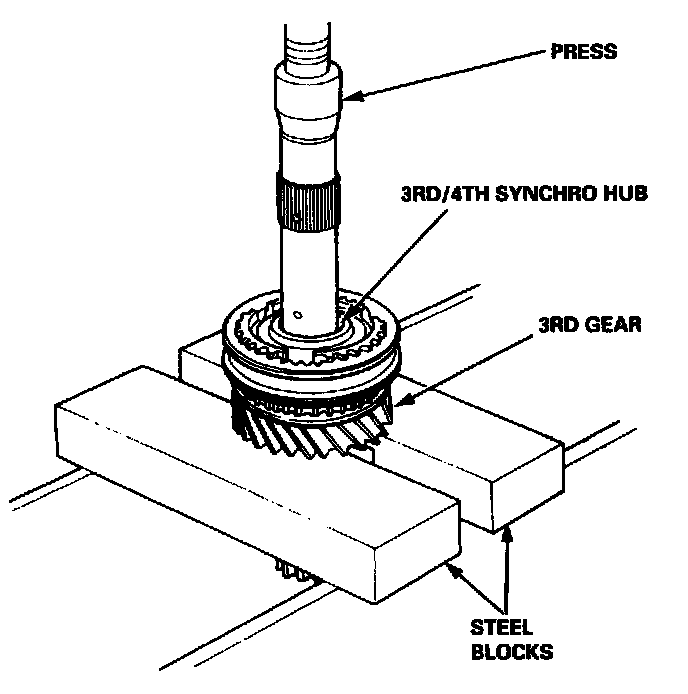 CAUTION: Remove the synchro hubs using a press and steel blocks as shown. Use of a jaw-type puller can cause damage to the gear teeth.