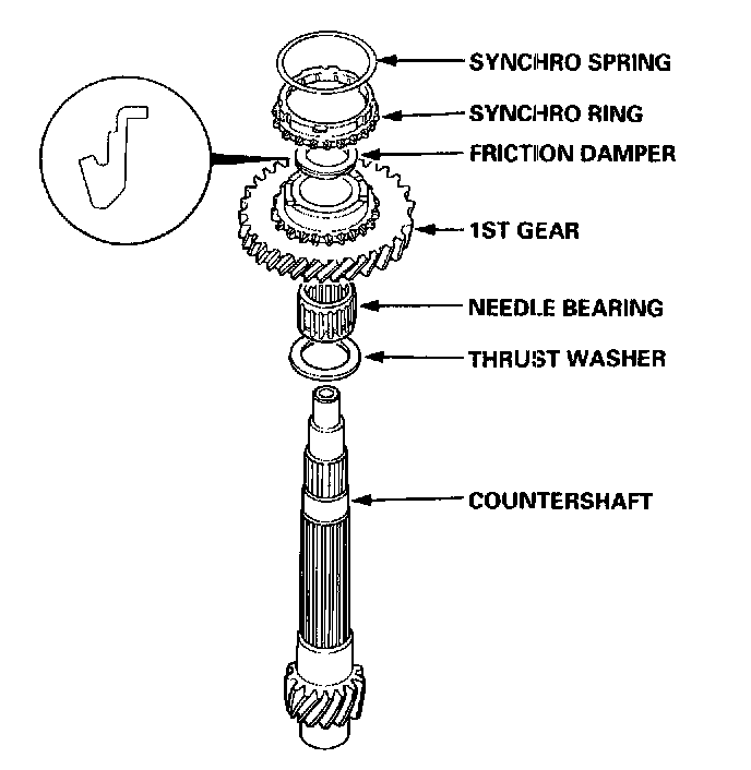 1. Install the thrust washer, needle bearing, 1st gear, friction damper, synchro ring, and synchro spring.