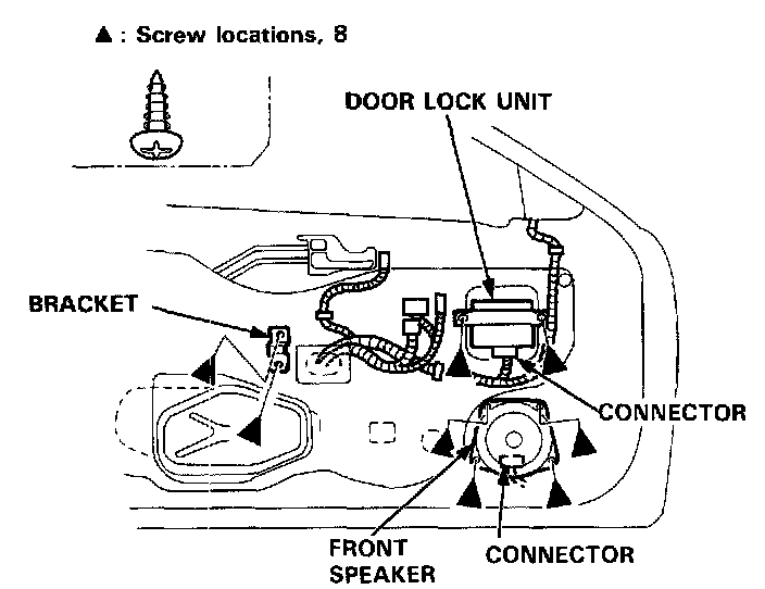 6. Remove the bracket and door lock unit. If necessary, remove the front speaker. Disconnect the connectors.