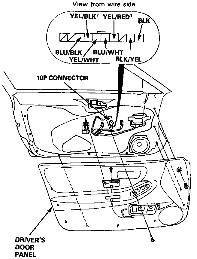 If the mirror does not tilt down (or does not swing left), remove the right door panel and check for an open in the YEL/WHT (or BLU/BLK) wire between the right mirror and the switch. If the wire is OK, check the right mirror actuator.