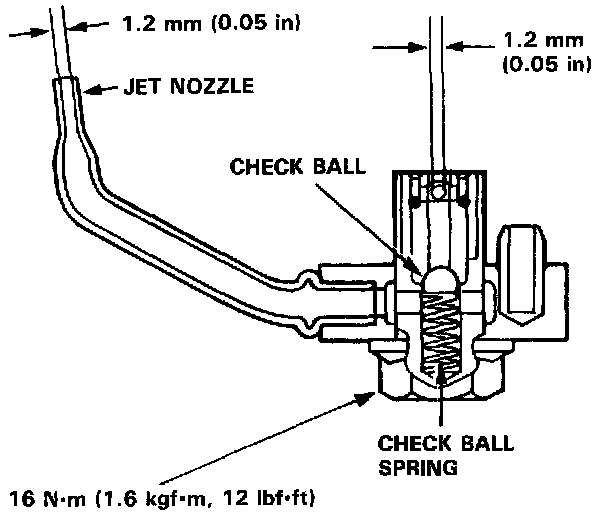 - Check the oil jet operation with an air nozzle. It should take at least 200 kPa (2.0 kgf/cm2, 28 psi) to unseat the check ball.