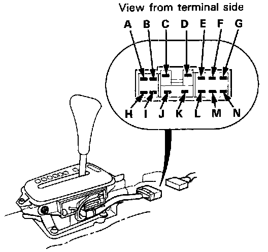 3. If the fuse and bulbs are OK, disconnect the 14-P connector from the A/T gear position switch (backup light switch).
