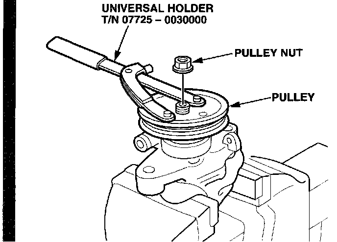 1. Remove the power steering pump from the car. Refer to page 17-18 of the 1999-01 3.2TL Service Manual or page 17-35 of the 1998 Integra Service Manual.2. Clamp the power steering pump in a vise with soft jaws. Hold the pulley with the special tool, and remove the pulley nut and the pulley.