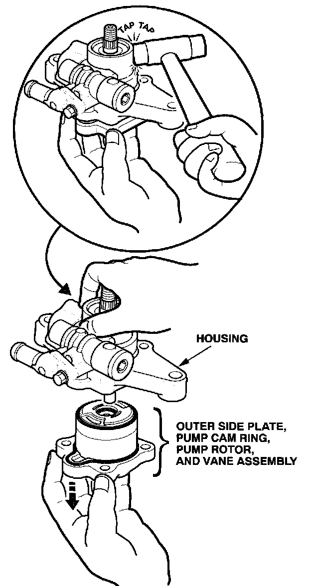 5. Hold the power steering pump assembly with the pump cover on the bottom. Loosen the pump housing by gently tapping the side of it with a plastic hammer. With one hand holding the pump cover, slowly pull the housing off. The outer side plate, pump cam ring, pump rotor, and vane assembly will slide out of the housing as an assembly. Place this assembly, as you removed it, on a clean workbench.