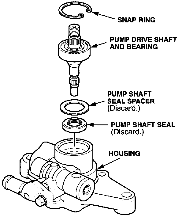 6. Remove the snap ring. Use a plastic hammer to tap out the pump shaft and bearing from the housing.