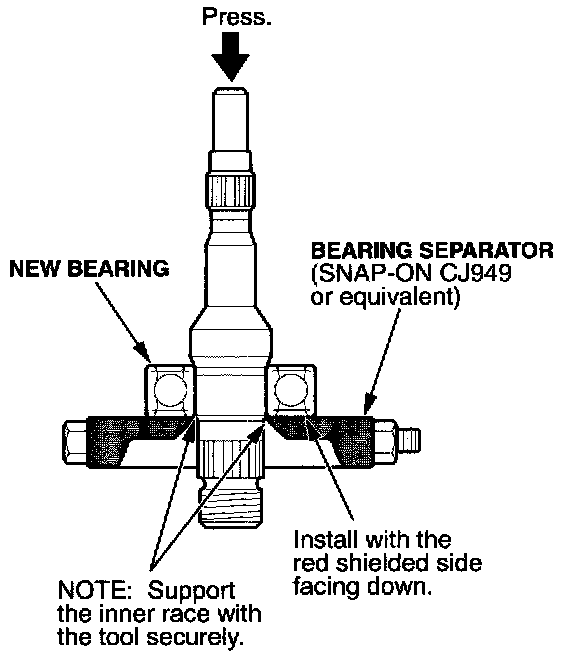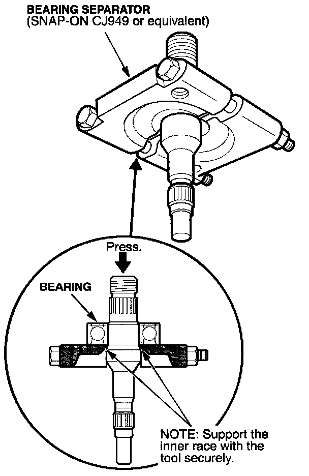 7. With a press and a bearing separator tool (Snap-On Bearing Splitter CJ949 or equivalent), remove the bearing from the pump shaft. Discard the bearing.