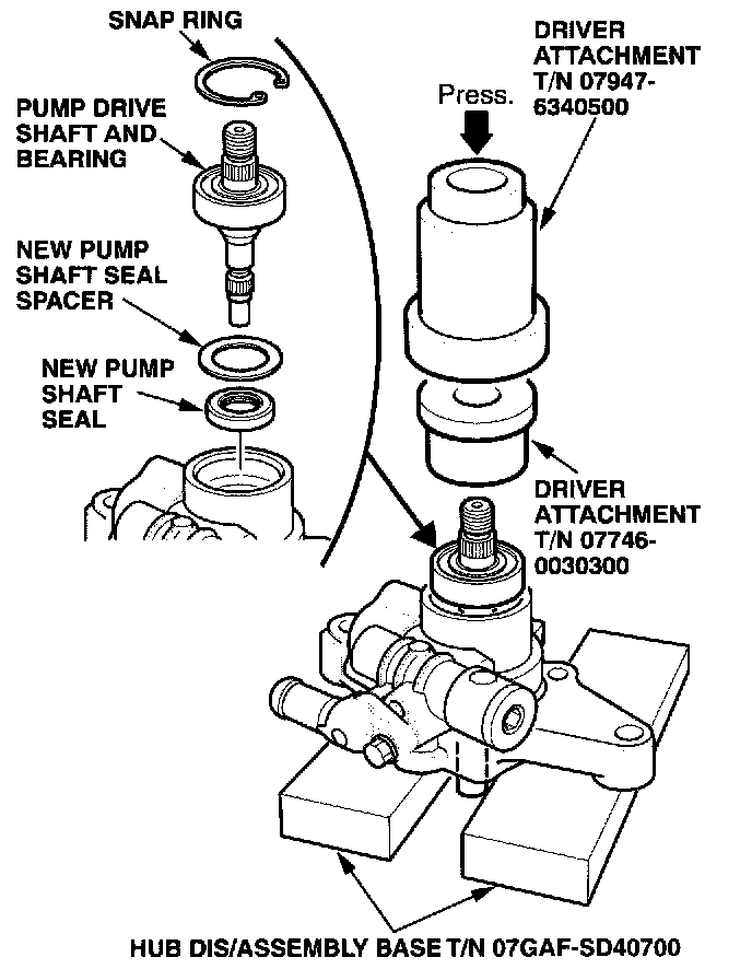 10. Press the shaft and spacer into the pump housing using the special tools. Install the snap ring with the radiused side of the snap ring facing out.