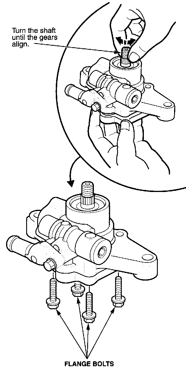14. While twisting the pump shaft to align the gears, slide the pump cover assembly into the pump. Secure the pump cover assembly to the housing with the four flange bolts. Torque the flange bolts to 20 N.m (14 lb-ft).
