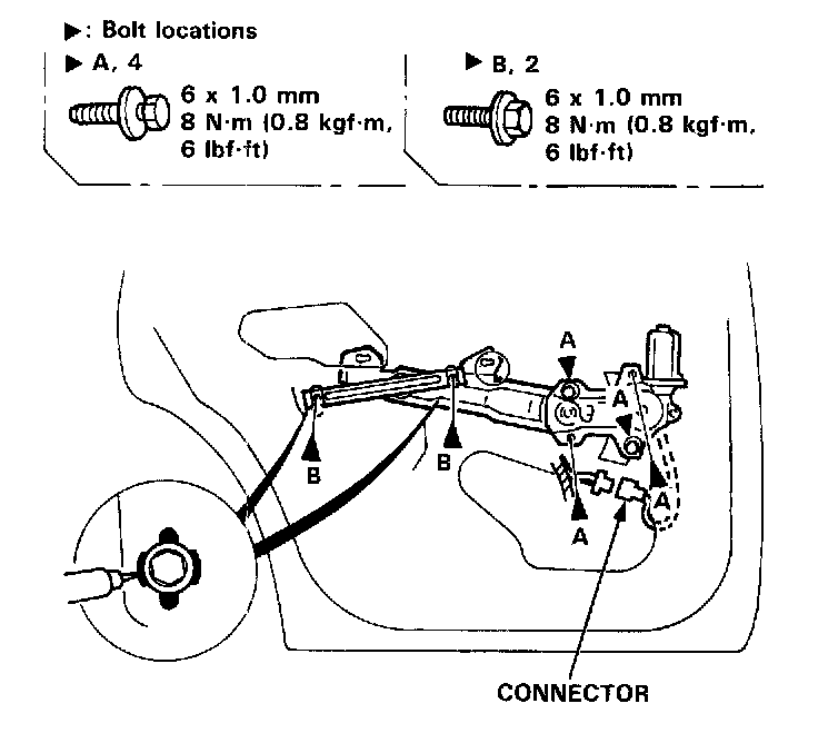 7. Disconnect the connector, and remove the regulator through the center hole in the door.