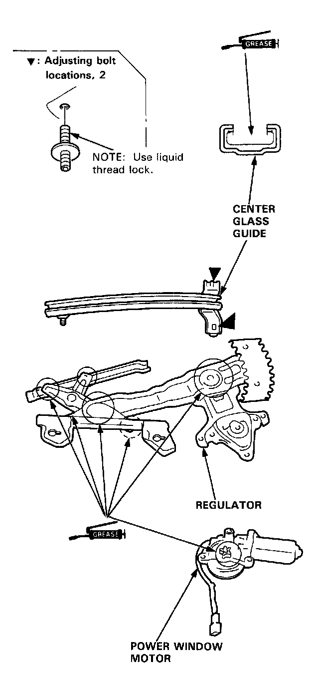 9. Grease all the sliding surfaces of the regulator and center glass guide where shown.