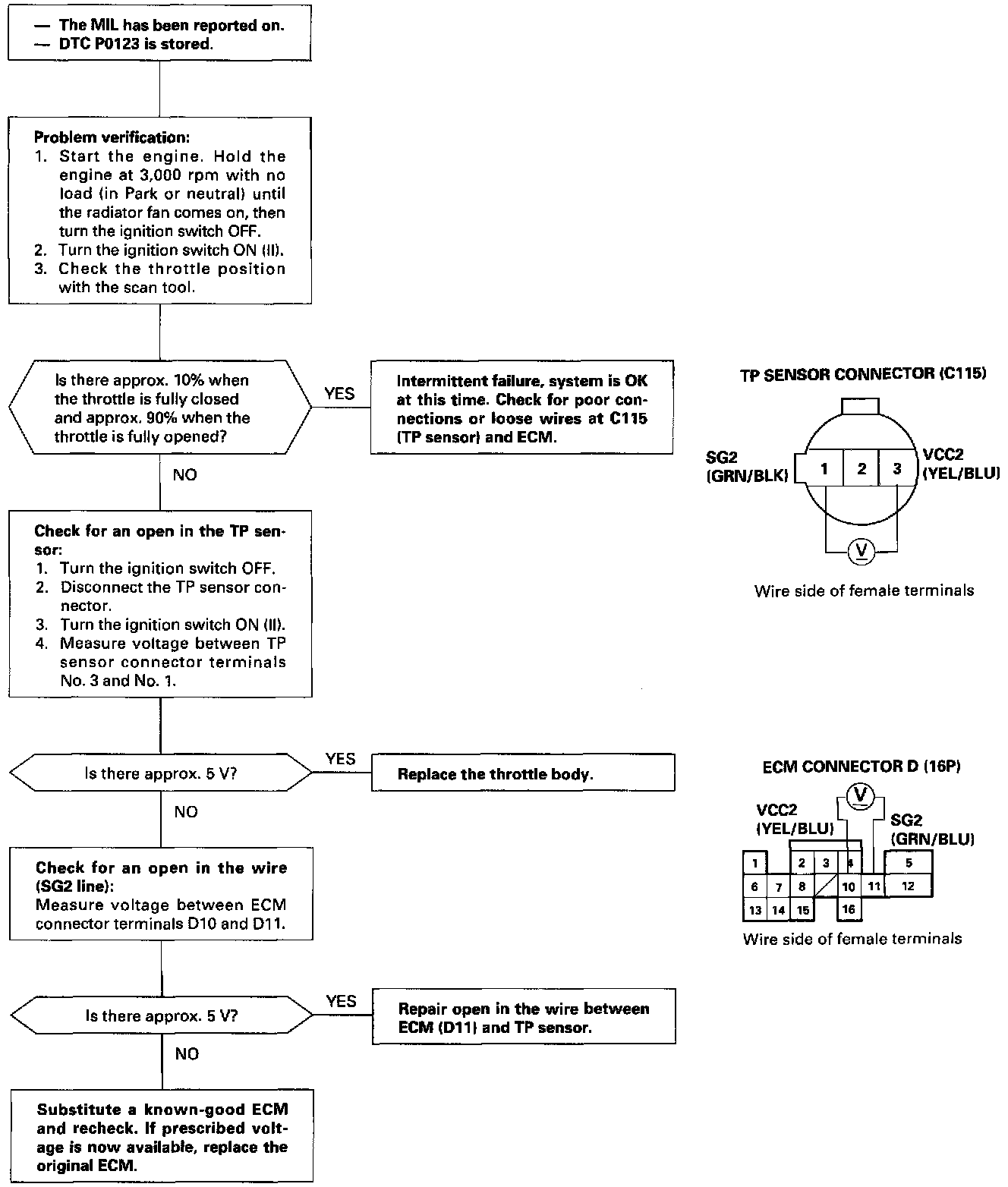 The scan tool indicates Diagnostic Trouble Code (DTC) P0123: A high voltage problem in the Throttle Position (TP) sensor circuit.