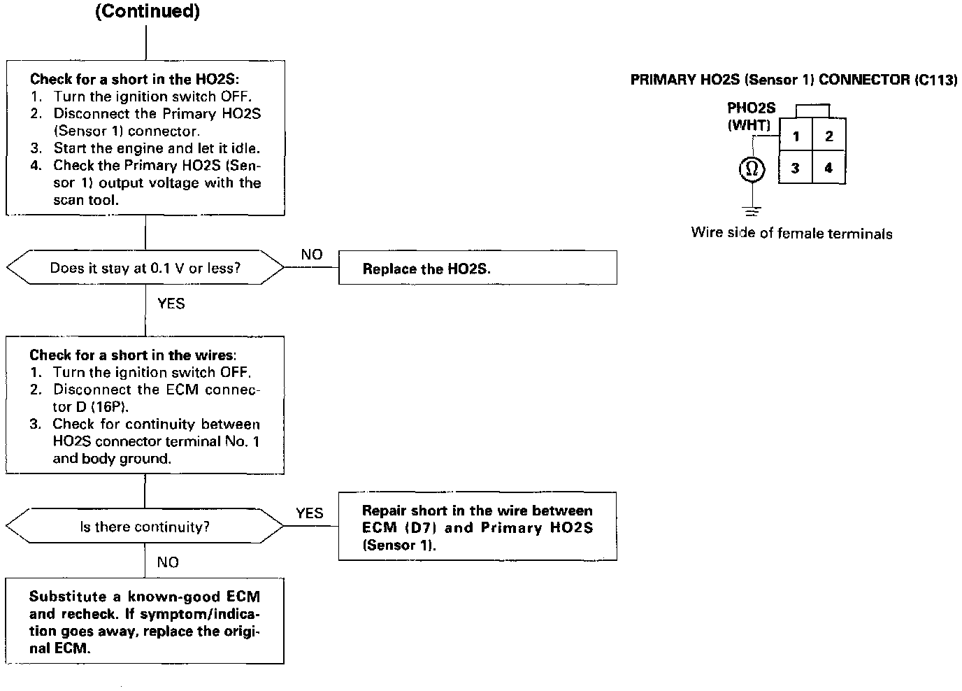 [P0131] The scan tool indicates Diagnostic Trouble Code (DTC) P0131: A low voltage problem in the Primary Heated Oxygen Sensor (HO2S) (Sensor 1) circuit.