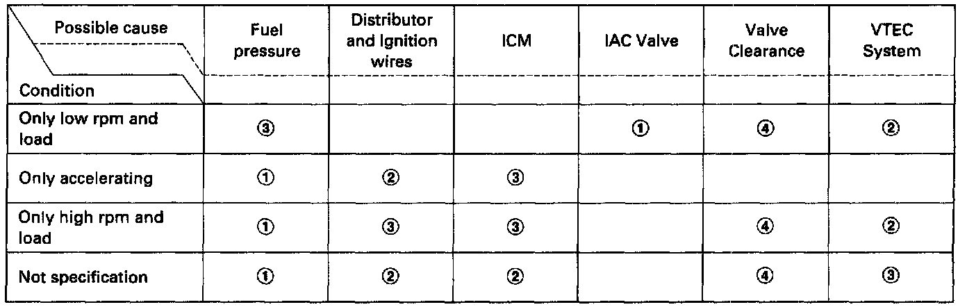 By test-driving, determine the conditions during which misfire occurs. Depending on these conditions, test in the order described in the table above.