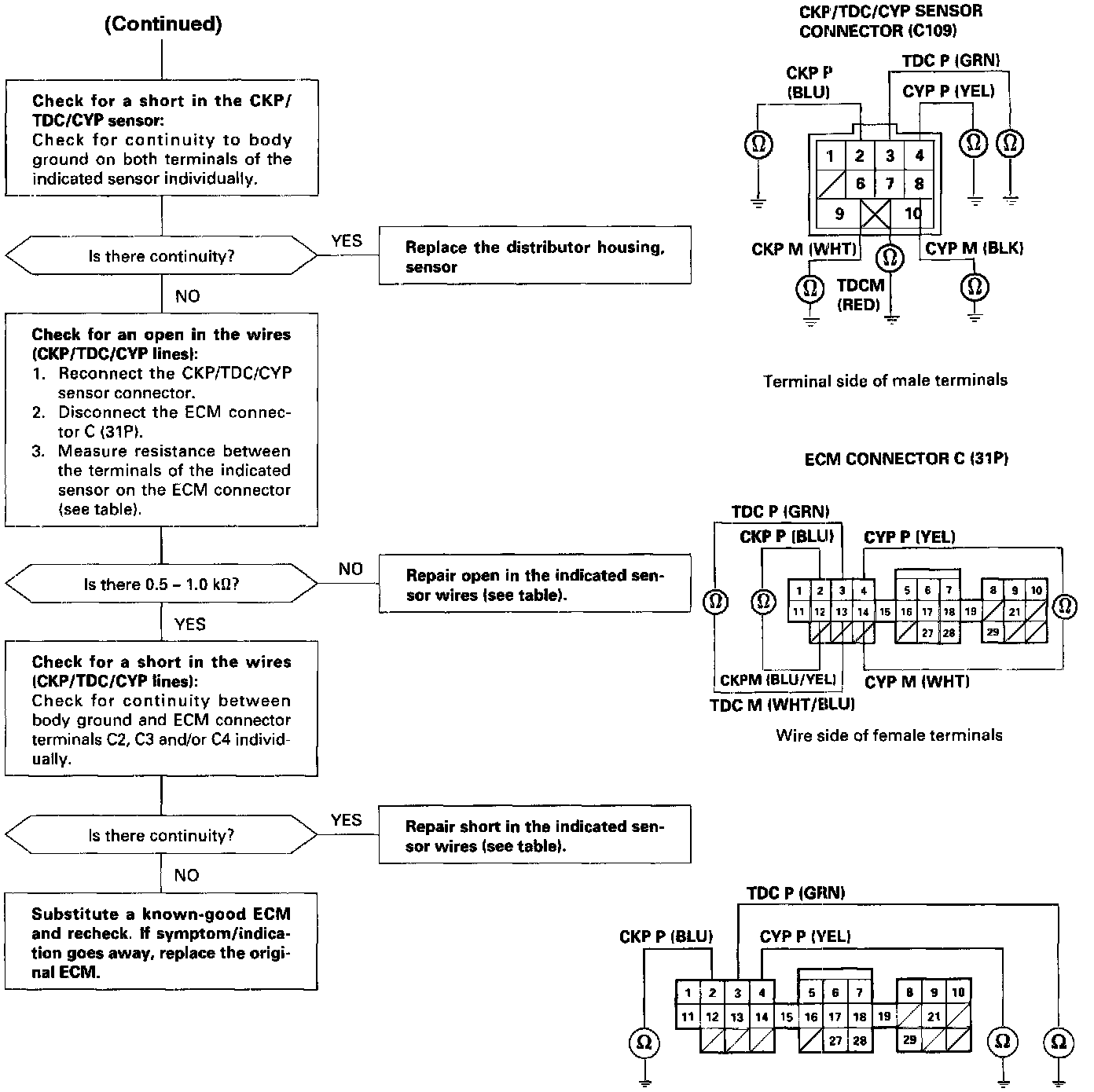 The CKP Sensor determines timing for fuel injection and ignition of each cylinder and also detects engine speed. The TDC Sensor determines ignition timing at start-up (cranking) and when crank angle is abnormal. The CYP Sensor detects the position of No. 1 cylinder for sequential fuel injection to each cylinder.