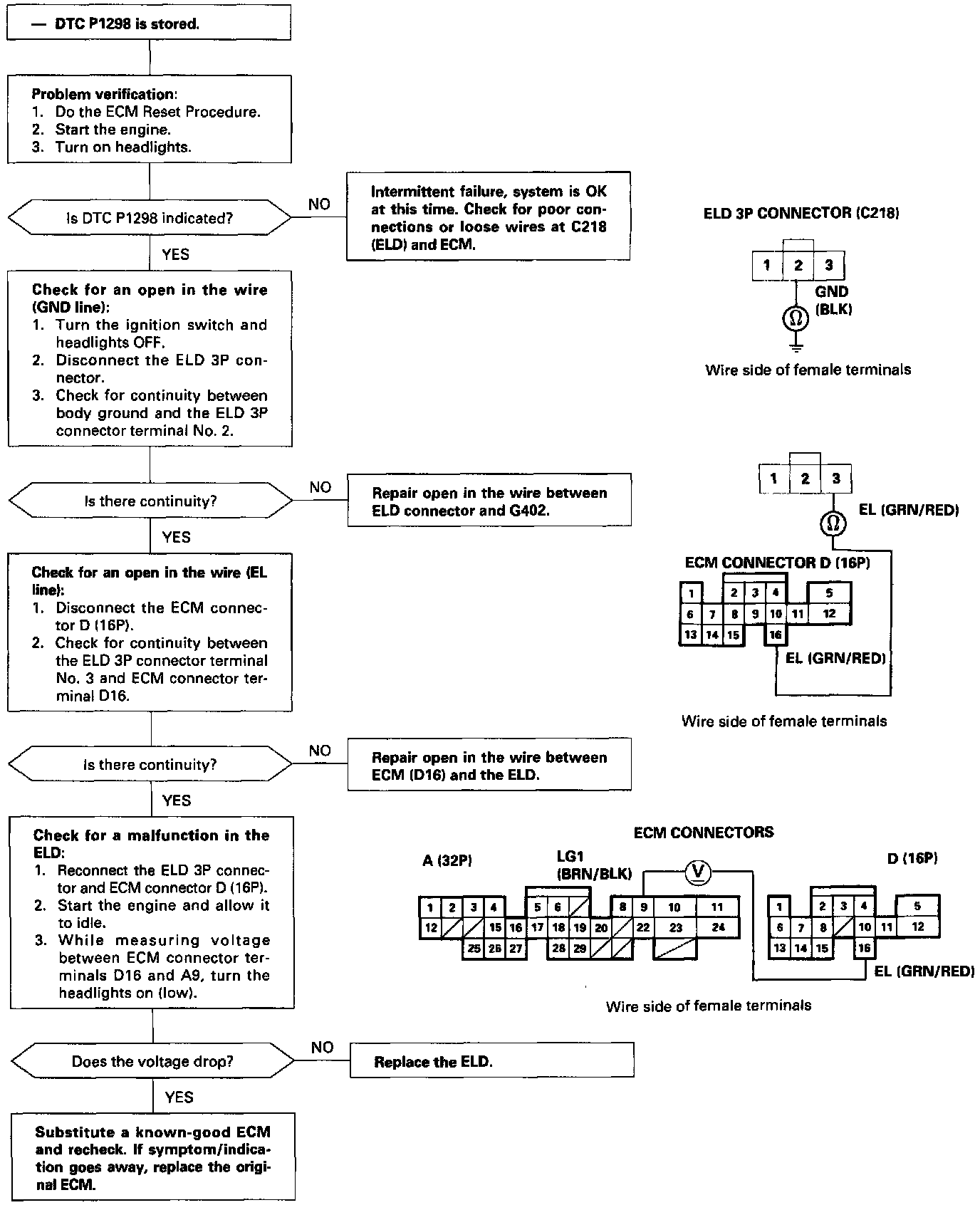 The scan tool indicates Diagnostic Trouble Code (DTC) P1298: A high voltage problem in the Electrical Load Detector (ELD) circuit.
