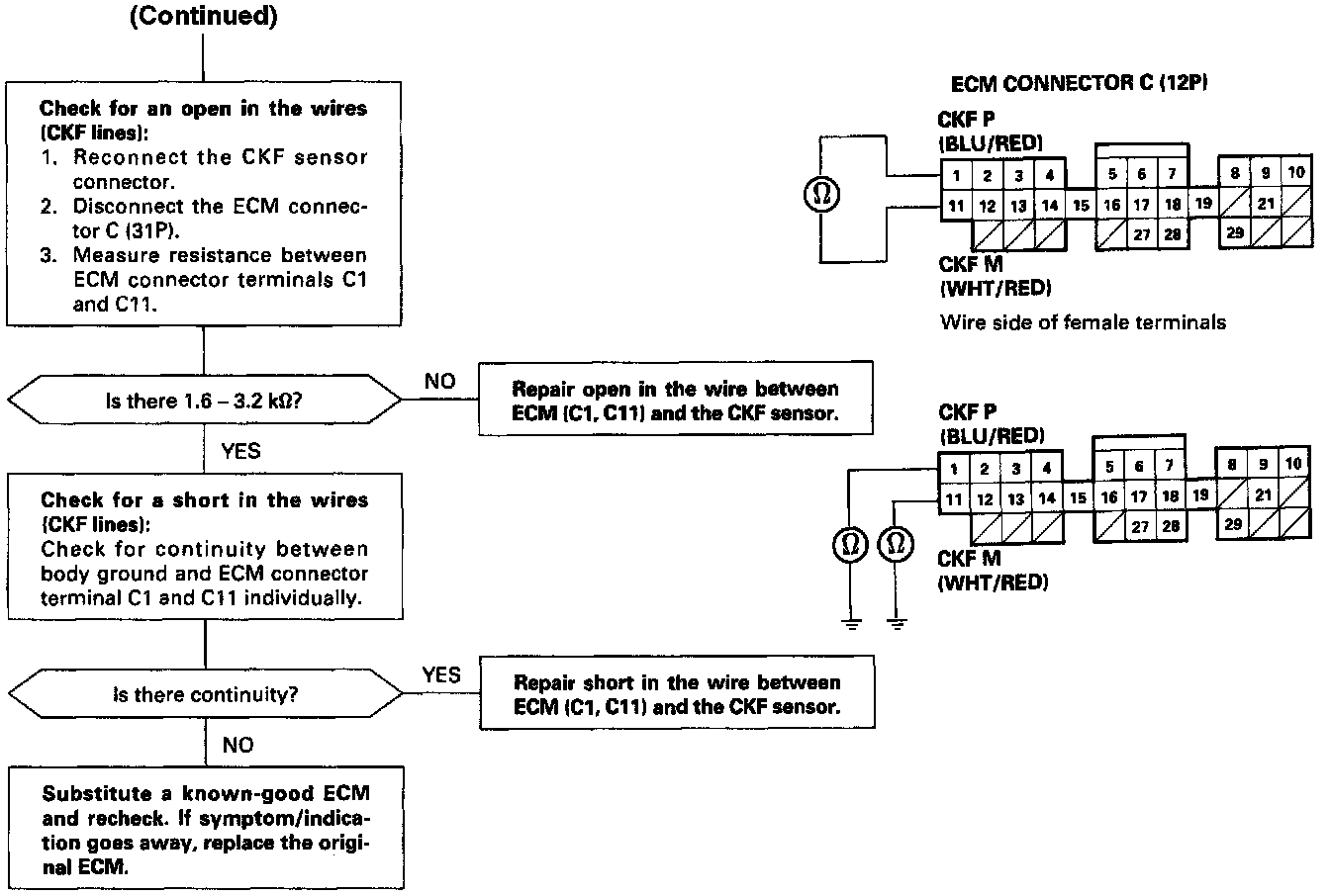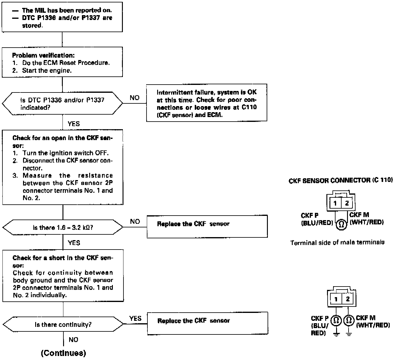 [P1336] The scan tool indicates Diagnostic Trouble Code (DTC) P1336: Intermittent interruption in the Crankshaft Speed Fluctuation (CKF) sensor circuit.