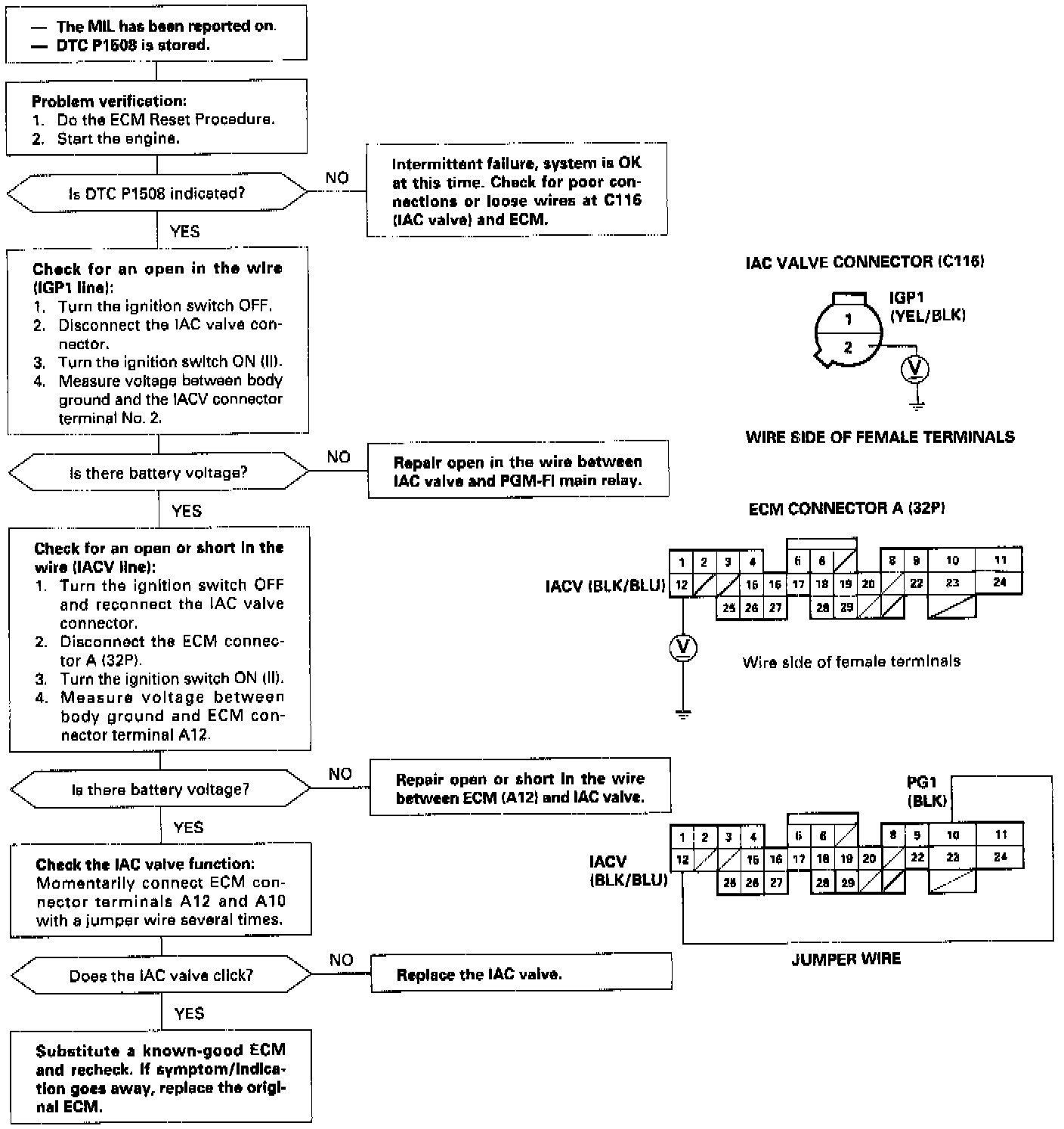 [P1508] The scan tool indicates Diagnostic Trouble Code (DTC) P1508: A problem in the Idle Air Control (IAC) valve circuit.