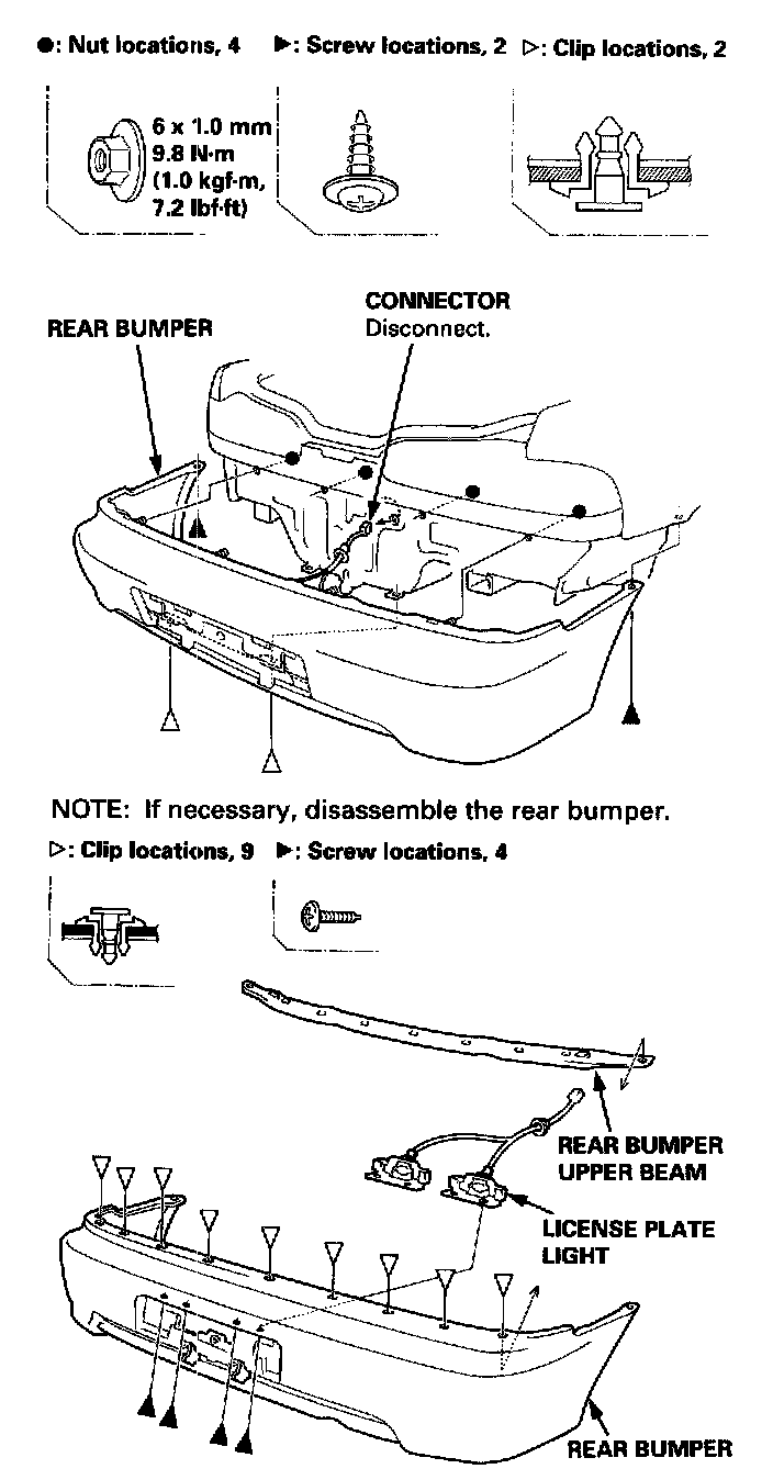 1. Remove the nuts, screws and clips, then remove the rear bumper.