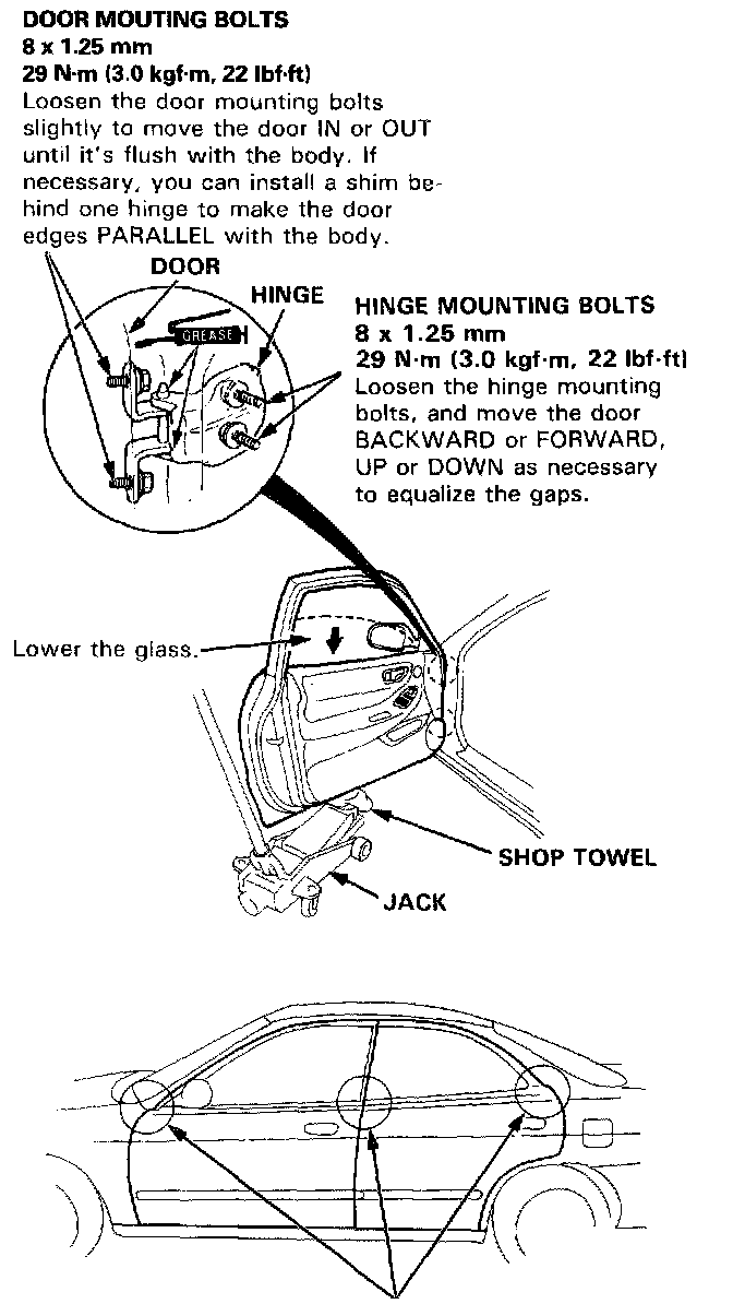 After installing the door, check for a flush fit with the body, then check for equal gaps between the front, rear, and bottom door edges and the body. The door and body edges should also be parallel. Adjust at the hinges as shown.