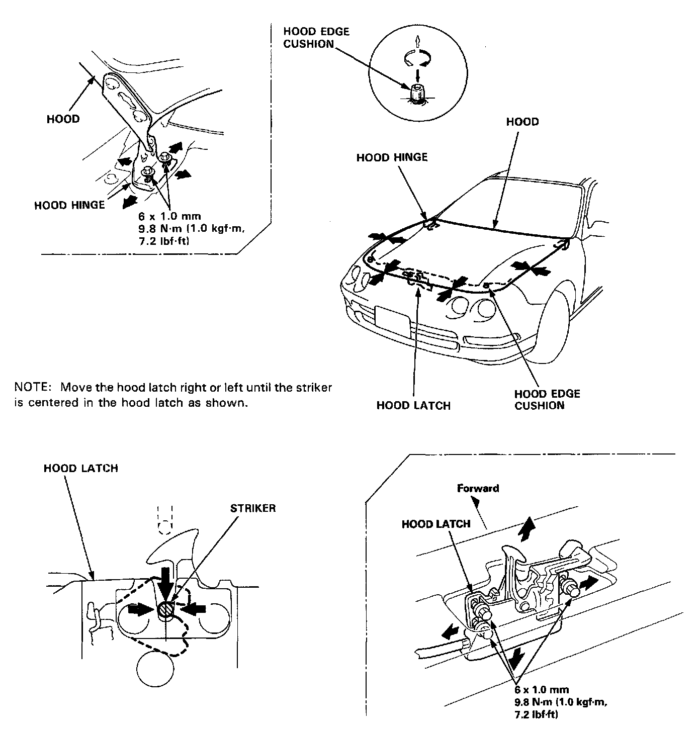NOTE: Before adjusting the hood, loosen each bolt slightly.
