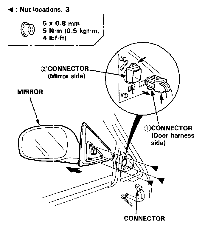 2. Disconnect the connector. Remove the nuts, then remove the mirror while holding it.
