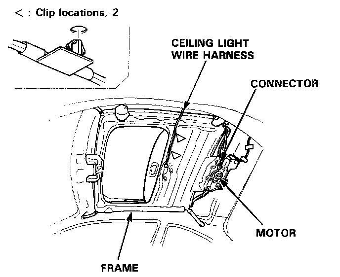 2. Disconnect the motor connector, and remove the clips securing the ceiling light wire harness.