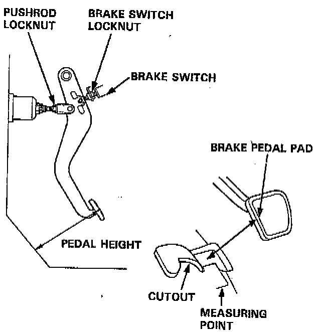 1. Disconnect the brake switch connector, loosen the brake switch locknut, and back off the brake switch until it is no longer touching the brake pedal.Brake Pedal Height: