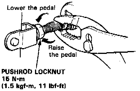 3. Loosen the pushrod locknut, and screw the pushrod in or out with pliers until the standard pedal height from the floor is reached. After adjustment, tighten the locknut firmly. Do not adjust the pedal height with the pushrod depressed.