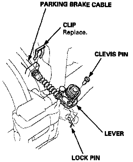 Disconnect the parking brake cable from the lever on the caliper by removing the lock pin and clevis pin, and remove the cable from the arm by removing the clip