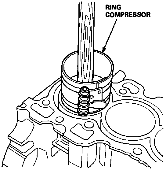 NOTE: Maintain downward force on the ring compressor to prevent rings from expanding before entering the cylinder bore.