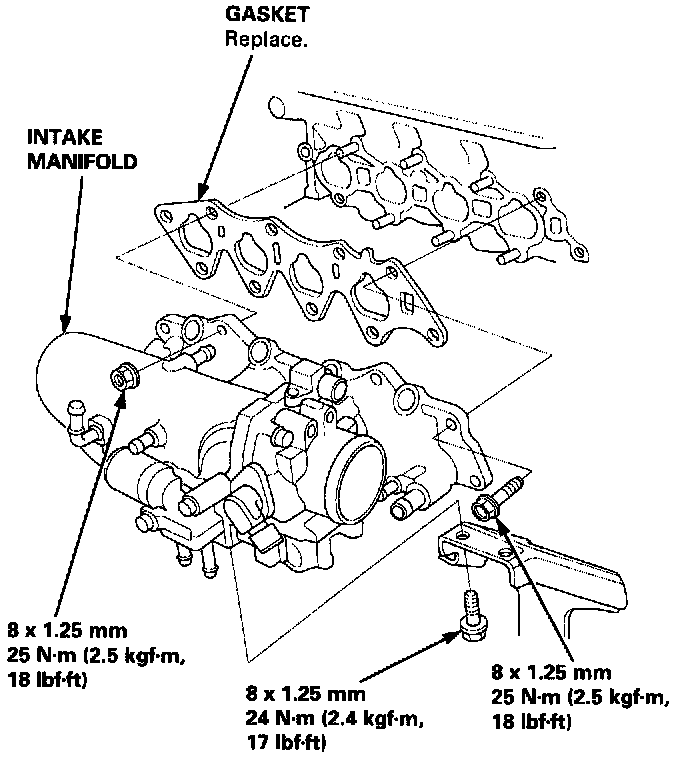 Install the intake manifold and tighten the nuts in a crisscross pattern in two or three steps, beginning with the inner nuts.